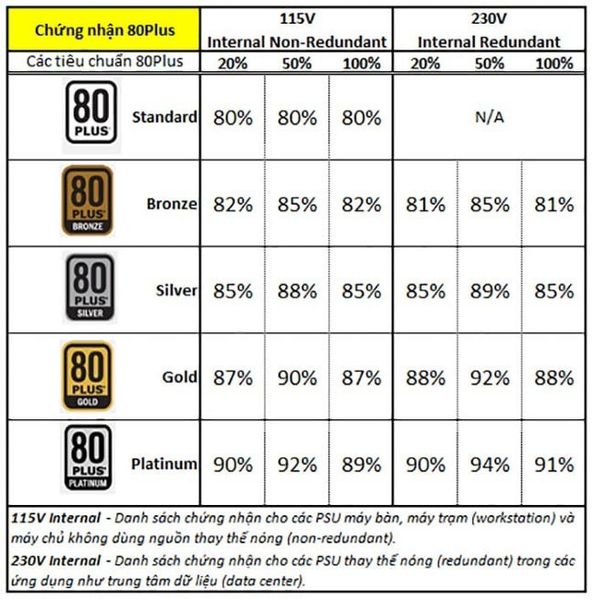 Một nguồn máy tính tốt cần có chứng nhận 80Plus để đảm bảo hiệu suất chuyển đổi điện năng. Chứng nhận này gồm các mức: